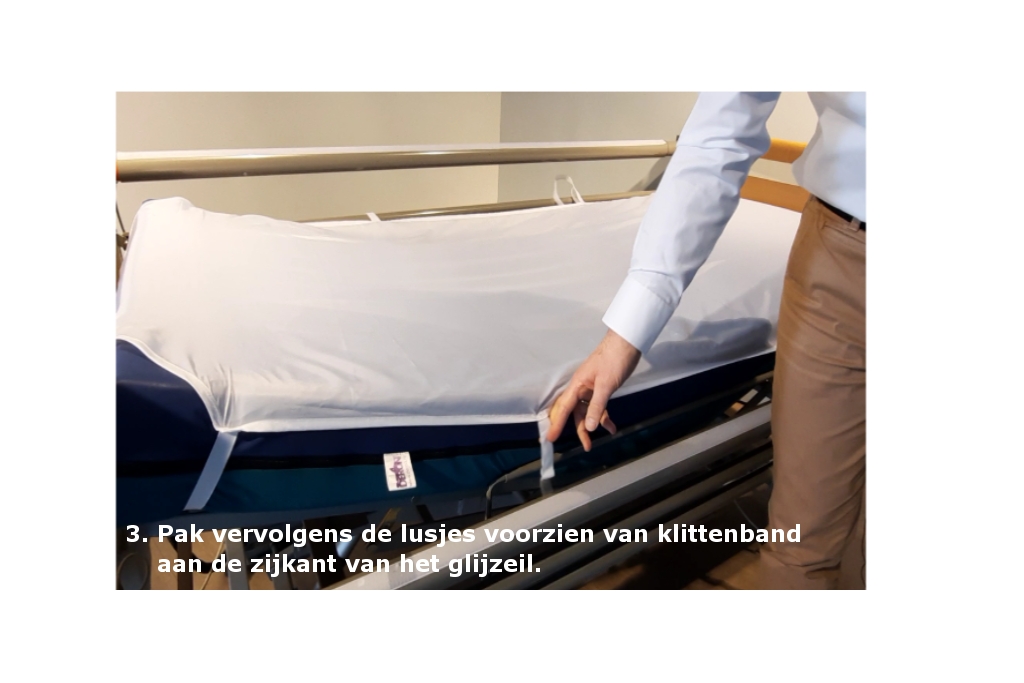 Het kan zijn dat er niet vanaf hetzelfde punt begonnen is met bevestigen op de rolbuis. Probeer het wentellaken gelijktijdig te bevestigen. Start met het bevestigen van het laken op het klittenband van de rolbuis aan het hoofdeind. Trek dit vervolgens door naar het voeteneind.
